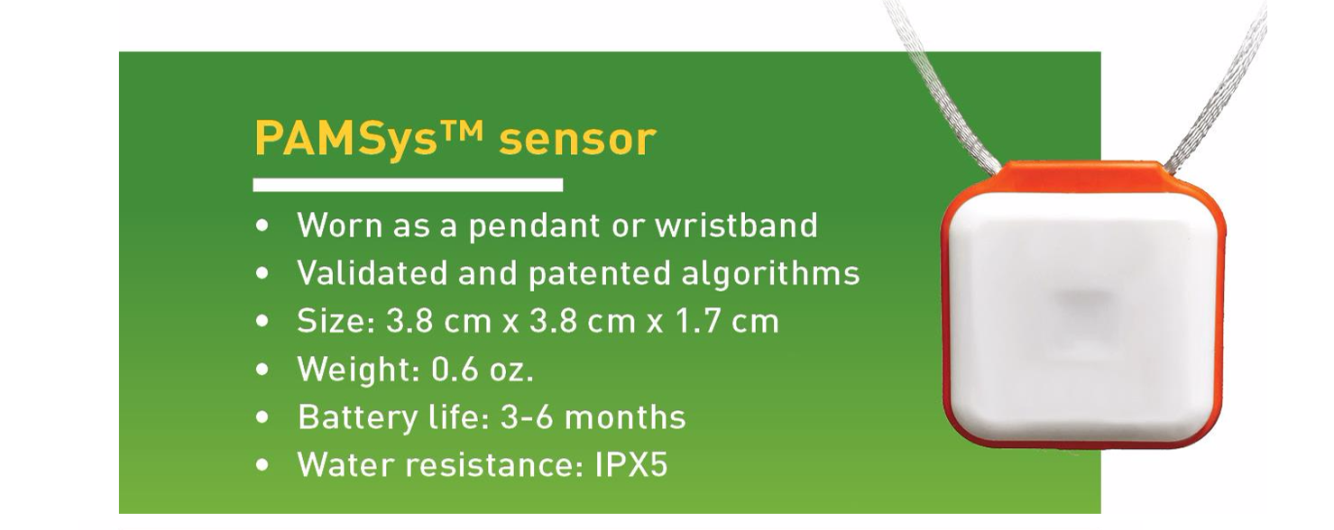 PAMSys: The most advanced wearable sensor for monitoring walking parameters, posture and postural transition, sedentary behavior, sleep and sleep quality, and falls during activities of daily living. PAMSys measures 40+ independent parameters of physical activity and has been used in 10+ clinical trials for collecting secondary and primary endpoints.